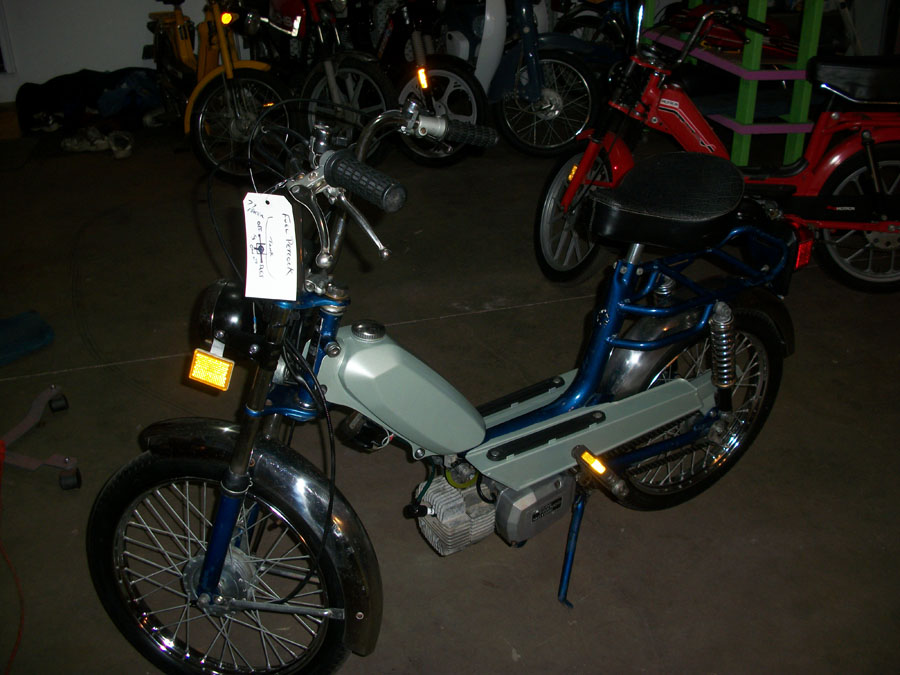 This moped went through a very quick semi-restoration that included a rebuilt engine and new paint on the tank and side covers. It could have have very easily been converted to a full restoration project but there wasn’t a lot of demand for one in that condition. The frame was left alone and only touched up and some parts were swapped out from a donor bike. The entire project from start to finish took place over 6 days.