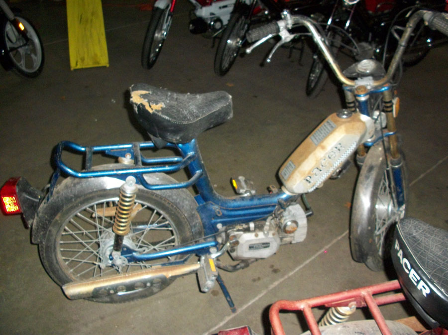 A Partially restored 1977 Pacer P-14 with a Morini M01 Engine. This Italian moped was a very mass produced version that found its way into the US under many, many different brand names and only minor subtle differences. The frame is very well built and rugged.