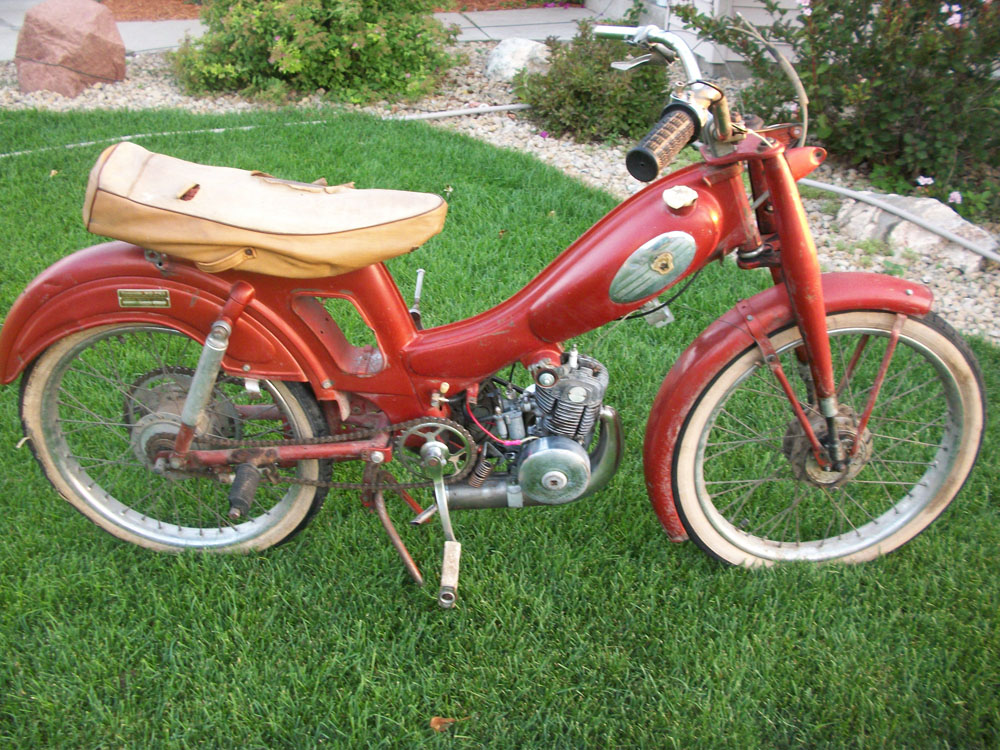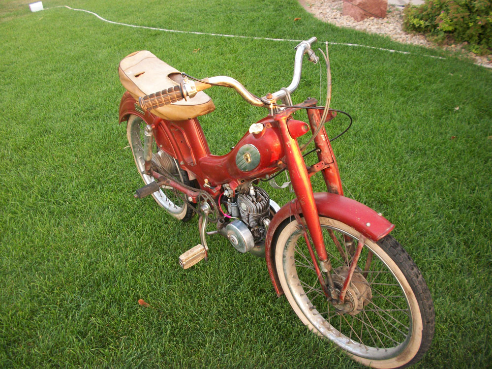 Here is a semi-complete…..okay, somewhat complete Moby/Riverside with a good AV88 variated engine. The model year should be either a 1962 or 1963 but we are not positive. You can either use this as a parts bike or the start of a restoration project. The frame is clean and in excellent shape but you will have to grind off someone’s attempt to weld on passenger pegs. The engine appears to be fully functional and is complete including variated clutch, magneto, carb and exhaust. Other good notable parts are the belt pulley, shocks, rims, handlebar and pedal crank. What you see is what you get. $150.00.
