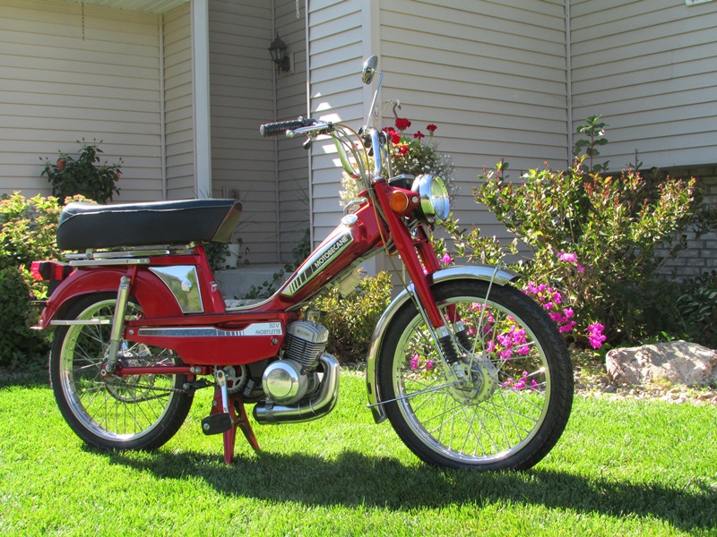 This wonderfully reconditioned moped just received a professionally rebuilt engine and carb, rebuilt wheels, new tires, and much, much more! Every moving part was fully serviced and inspected and every painted and chrome part was polished.