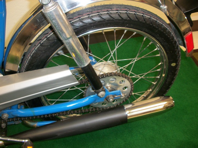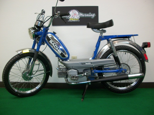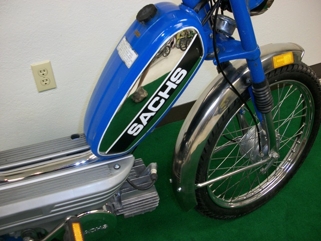 Here is an excellent reconditioned German made traditional step-thru moped. It is a true Sachs which means that the entire bike, chassis and engine, were manufactured in former West Germany. The uniqueness of this moped is that it is powered by a Sachs 505-1D engine which was more commonly found in sportier top-tank models like the Prima G3. In its stock state, it will run strongly at 30 mph all day long but has the capability of speeds over 40 mph with minimal enhancements.