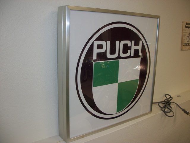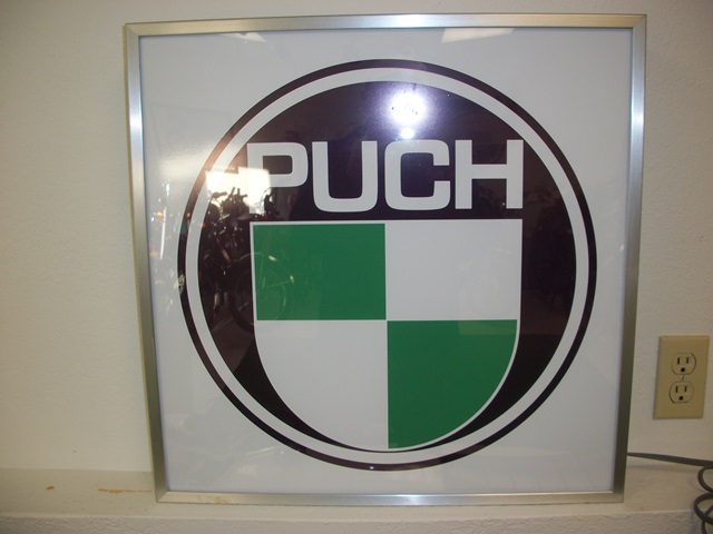 Brand new large Puch logo signs. These signs are very high quality and commercial grade. Strong aluminum frames, UL approved multi-ballast and florescent lighting systems. By far the best built signs you will ever find. Use one in your moped shop, garage, office or business. Sign outside measurement is 22″ L x 22″ W x 3″ D and weighs approximately 21lb.