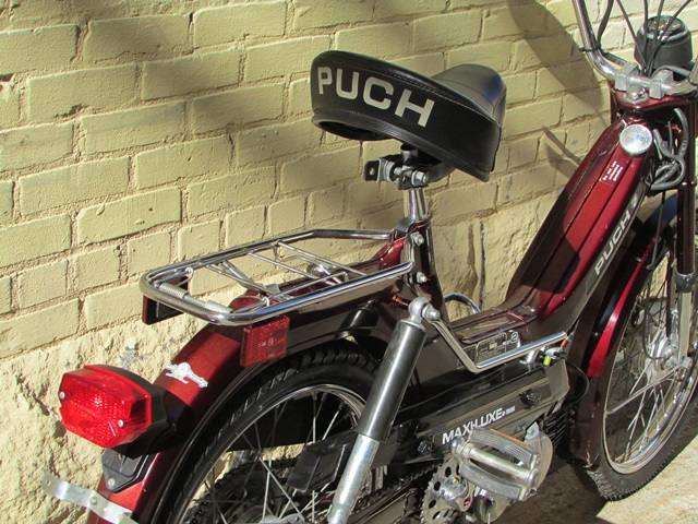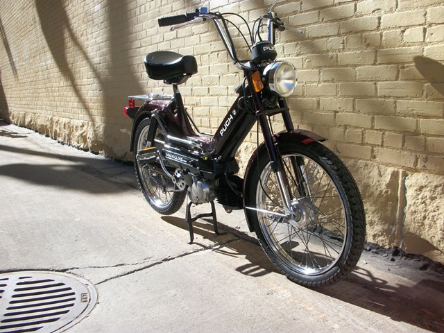 Fully reconditioned eggplant color Puch MaxiLuxe moped. Rebuilt hi-torque single speed engine and carb, new tires and brakes, electrical and many other new parts. This moped runs and feels like new and will be a reliable and fun form of transportation for anyone!