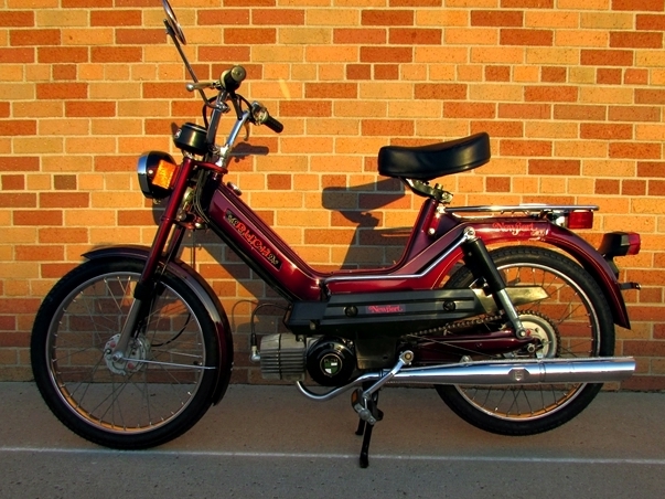 This 1977 Egg Plant Puch Newport was well cared for and is still in almost pristine condition. Both the original paint and the freshly polished chrome shine like new. The color of this bike tends to change depending on the lighting. Some times it looks brown; at other times, it looks like it is a deep purple or plum color. No matter the color, you’re sure to turn some heads while riding this moped. With a rebuilt E50 engine that gets up to speeds of over 30mph and new quality tires, you’ll enjoy your everyday outing, whether it be a pleasure ride, or a ride to work or the local store. $975.00