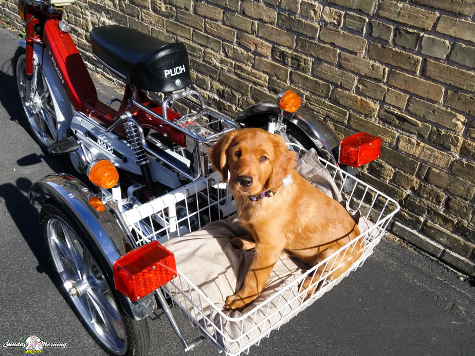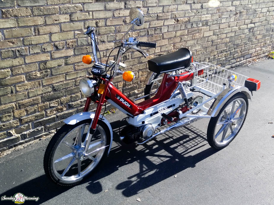 TriRad mopeds were a US made trike conversion that was assembled and distributed by Mopeds Midwest, Inc. based in Ames, IA during the height of the 70’s moped craze. Through a cooperative effort between them and a California manufacturing company, they designed and built the conversion kits that were available and could be fitted to either Puch or Tomos mopeds with some modifications. The Puch TriRads were available in a few different options and packages. The base model Puch TriRad was single rear wheel drive and used an aluminum E50 single speed engine with an approximate top speed of 25 mph. The deluxe models were available with 2 speed automatic engines, high-torque cylinders and a rear differential axle. There were also other add-on options like windshields, leg shields, canopies and a few different cargo boxes. They even offered an ice cream vendor box that could be used during parades or at the beach. Prices for TriRads ranged between $1350 for the base model to $3200 for the ice cream package. That would be in today’s money between the $4700 and $11,000! Though it is generally thought that TriRads were available between the years of 1979 and 1981, Sunday Morning Motors has had at least 2 original TriRads that were fitted to 1977 frames, so it is our belief the earliest models were being built from previous year moped stock when they were first being sold to the public.