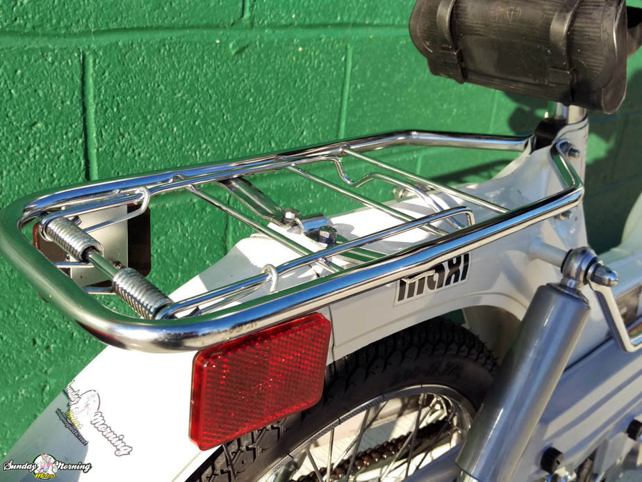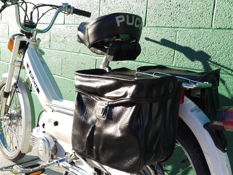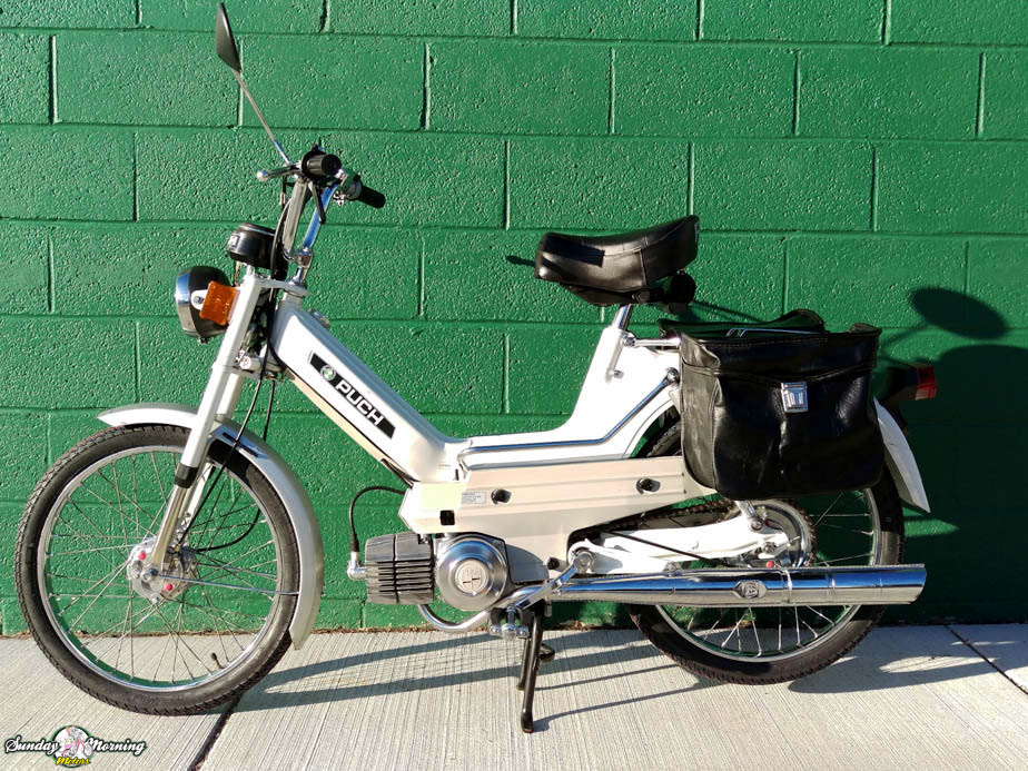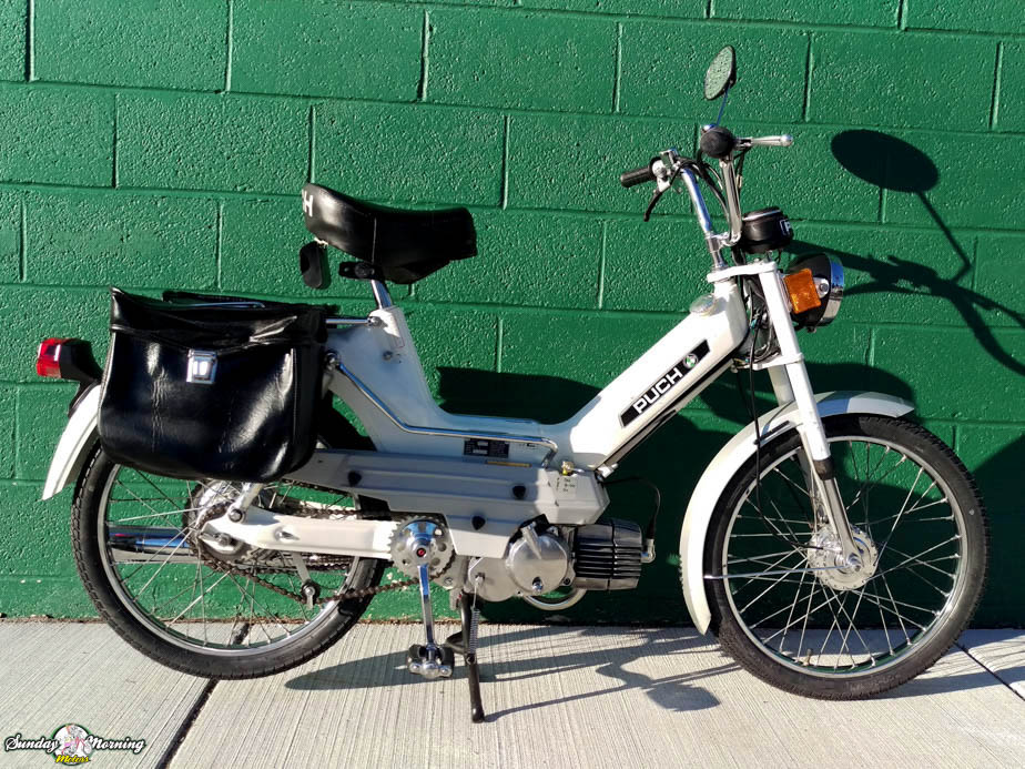 This is a fairly unique and totally beautifully reconditioned white 1977 Puch Maxi. White is the least common of all the paint colors that were available on Puch mopeds. This moped was owned by the same family since it was purchased new in late 1977, and was well taken care of and properly stored for the last couple of decades.