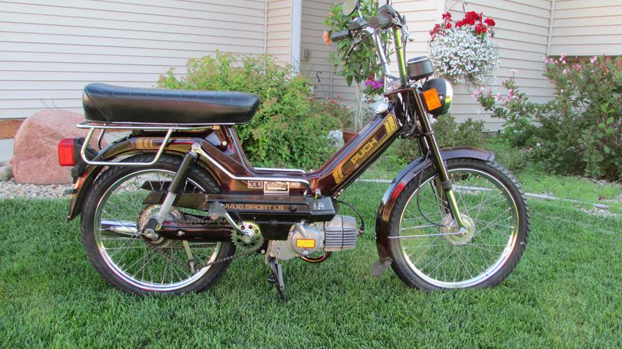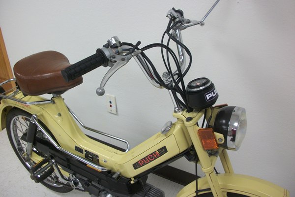 Look really close! It is beautifully preserved and now also completely reconditioned. This 2HP gold Puch Maxi II/auto shift that was owned by a wonderful woman who took very good care of it. She purchased it new in 1982 and was its sole owner and operator. Her husband at the time was against her buying the bike and felt it was a waste of time and money. She she told us how some of her fondest memories were from years ago with that bike and how she toted her young children around with it! Her prized gold moped stayed faithful to her for the last 32 years. Her husband left a long time before that!