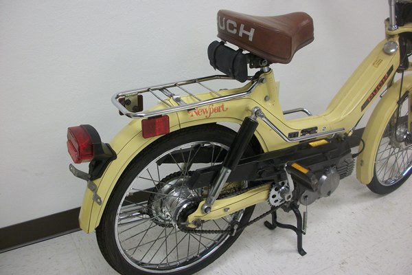 A very clean and recently reconditioned 1977 Puch Newport moped that has been thoroughly gone through and serviced from the front wheel bearings to the rear brakes. The 2 hp engine and carb have been fully rebuilt and it runs perfect. Top speed is over 30 mph! The headlight, brake light, tail light, horn and everything else works just like it did 35 years ago. The seat vinyl has been repaired on this bike so it is not perfect but it is still meets our high quality standards!