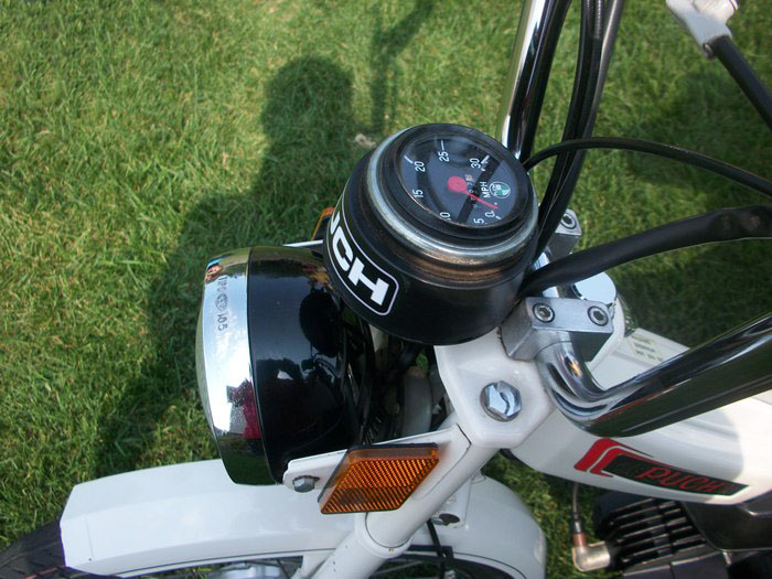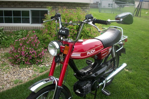 This Puch has all the good stuff like a professionally rebuilt 2 speed engine, high-torque cylinder, Maxi-Luxe chrome trim, heavy-duty rear shocks, new quality tires and a rebuilt Cat-Eye turn signal system that has been on the bike since it was new. This great vintage moped has been serviced and reconditioned from front to back and should give you many years of trouble free use just as it did for the previous owner.